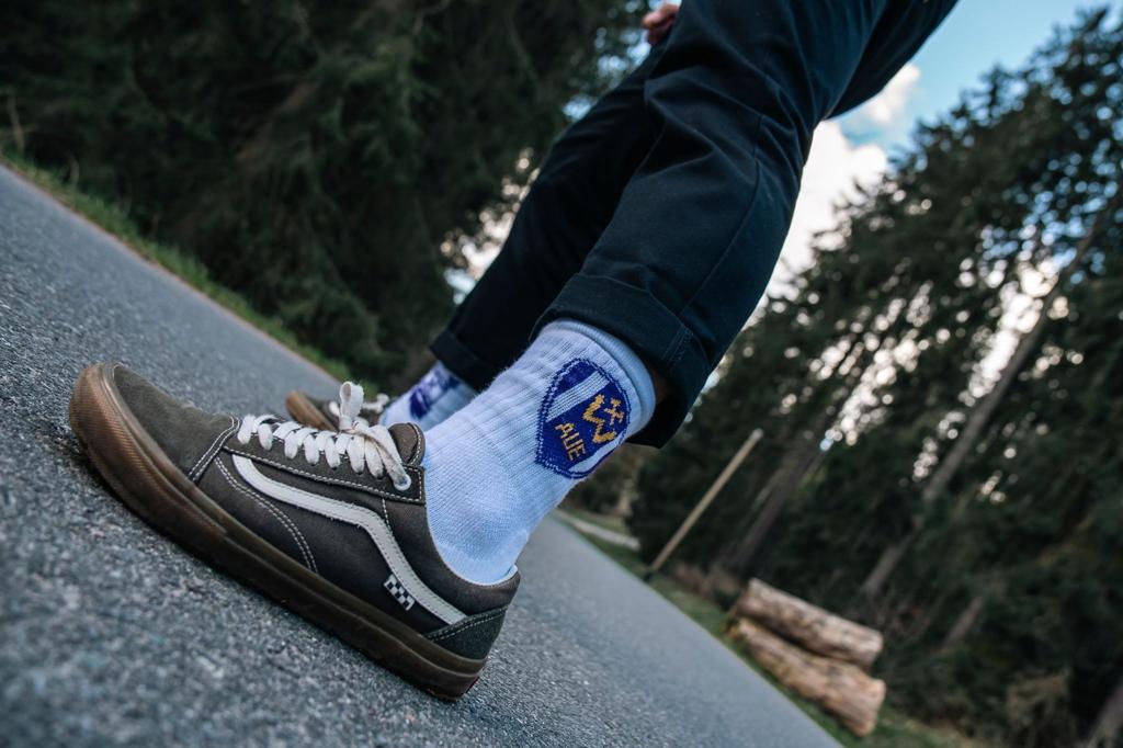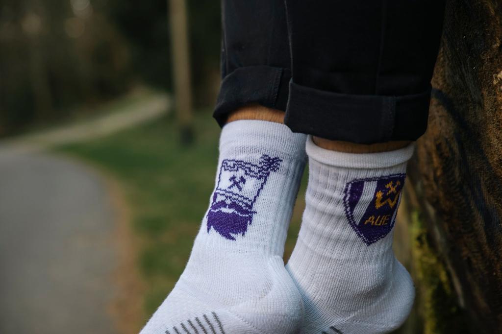 1 Paar Socken, Motiv AURP! Die Socken sind in der Farbe Weiß erhältlich und haben auf der Außenseite das BSG Wismut AUE Wappen. Die Innenseite ziert der bekannte AURP Nischl in Lila. Wir produzieren unsere Socken zu 100% im Erzgebirge, um die lokale Wirtschaft zu unterstützen. Sichert euch jetzt die exklusiven Socken im AURP Style und zeigt eure Verbundenheit mit der BSG Wismut AUE! Größen: 35 bis 38; 39 bis 42 und 43 bis 46