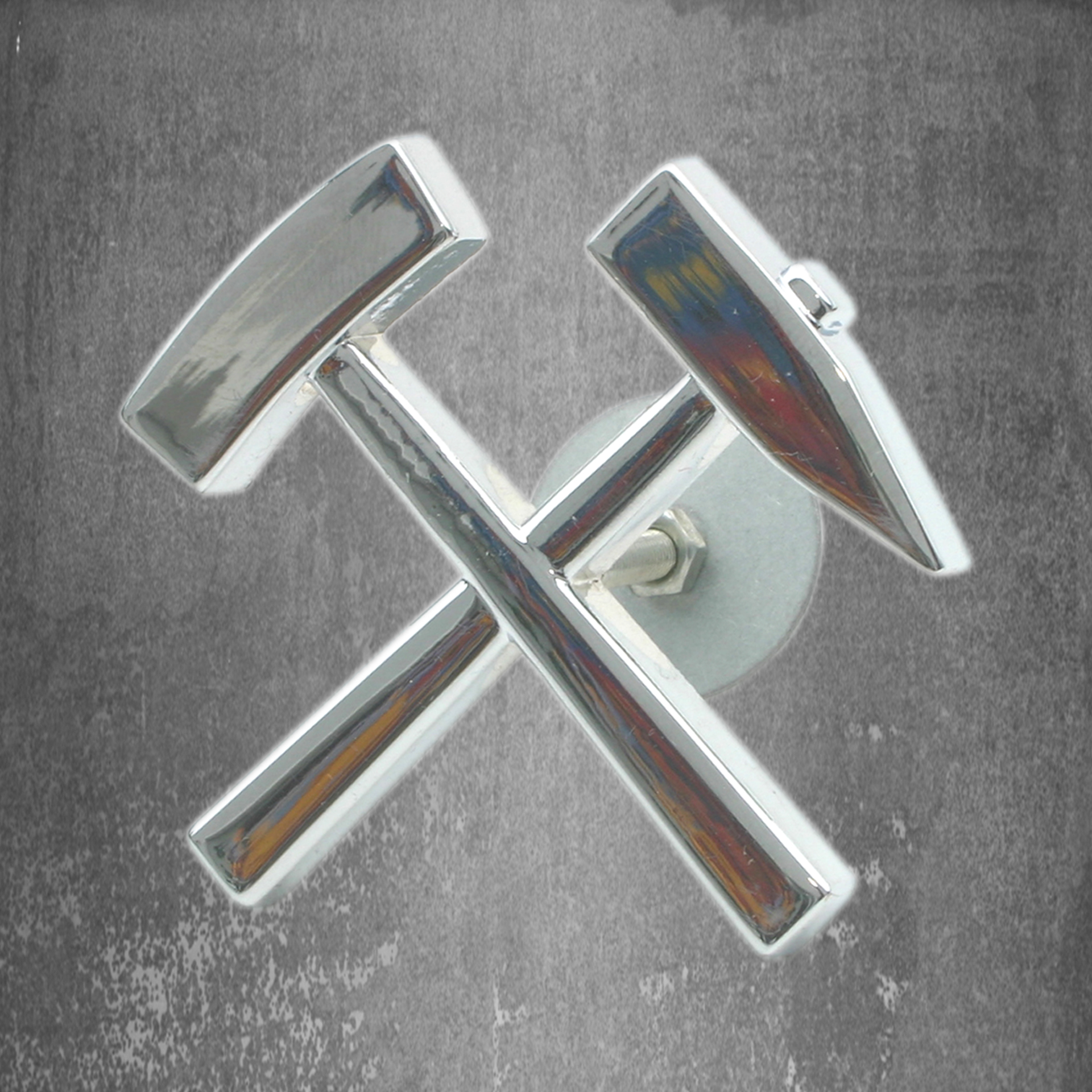 Massives, verchromtes Emblem der legendären "Zwei gekreuzten Hämmer"; Größe ca. 8,5 x 7,5 cm; z.B. zur Befestigung am Kühlergrill des Fahrzeuges